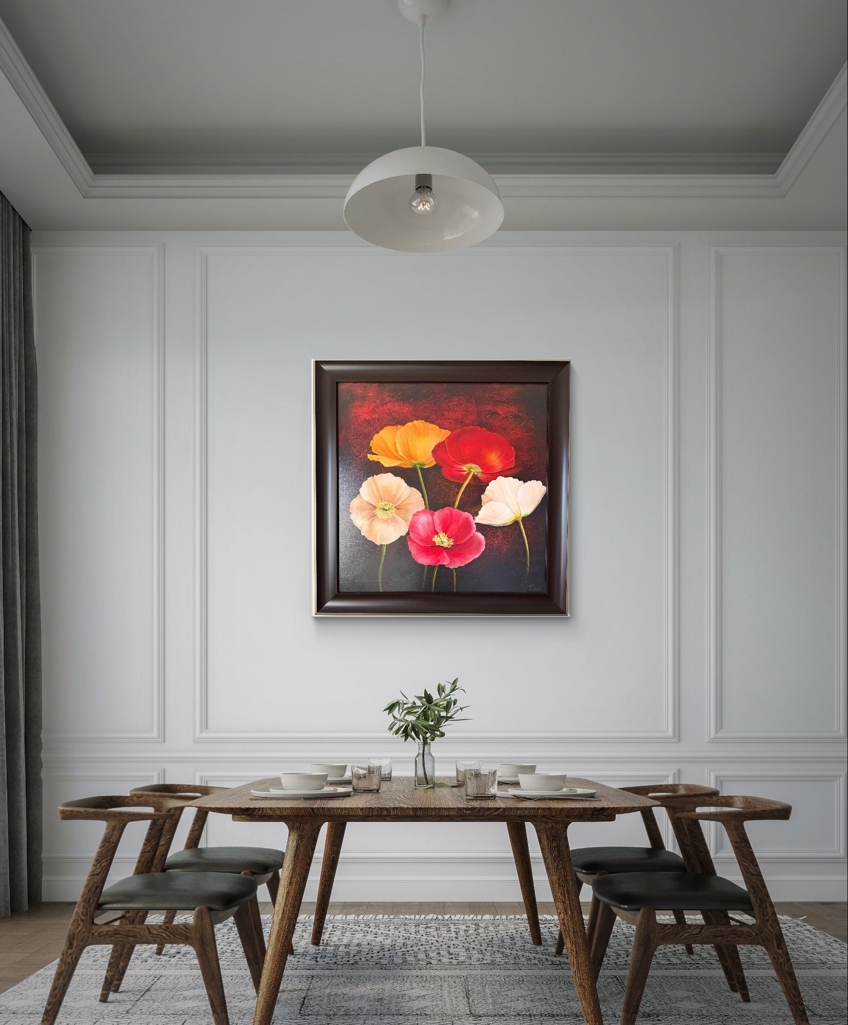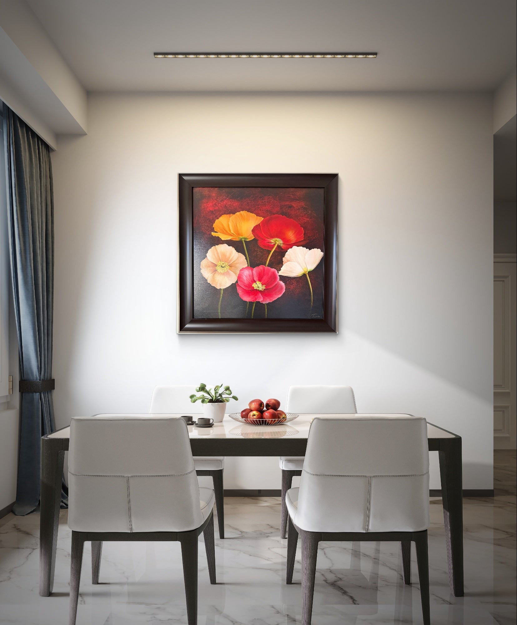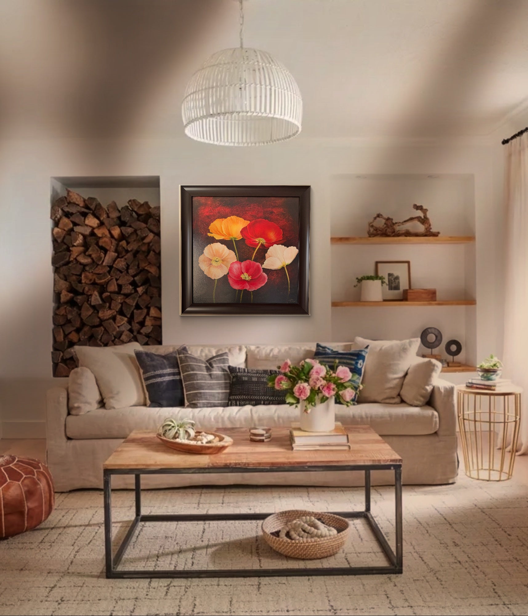 This excellent quality painting multi colored poppies combines precision and beauty, highlighting nature’s diversity through five distinct blossoms. A timeless piece that brings serenity and grace to any interior. I hanged it for some years. One imperfection is that there is a little scratch on the lower left corner of the frame, but I don't have time to repair it. This happened accidentally when I was moving. This framed canvas artwork showcases five realistic poppies in a spectrum of warm, inviting colors. Ready to hang, it adds a touch of refined floral beauty to any room — perfect for living spaces, dinner rooms, or hallways.