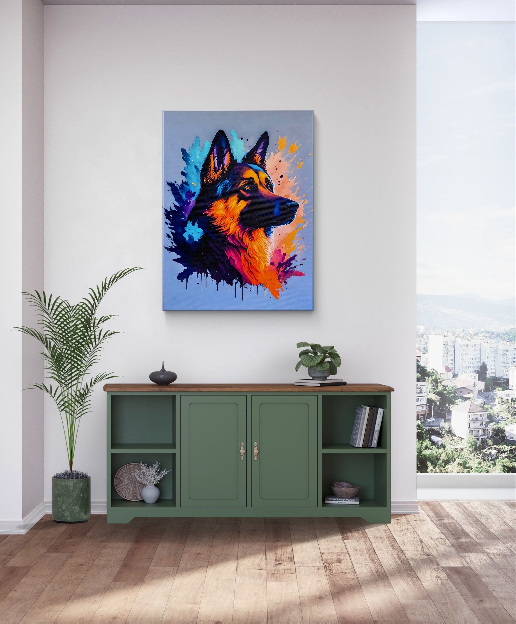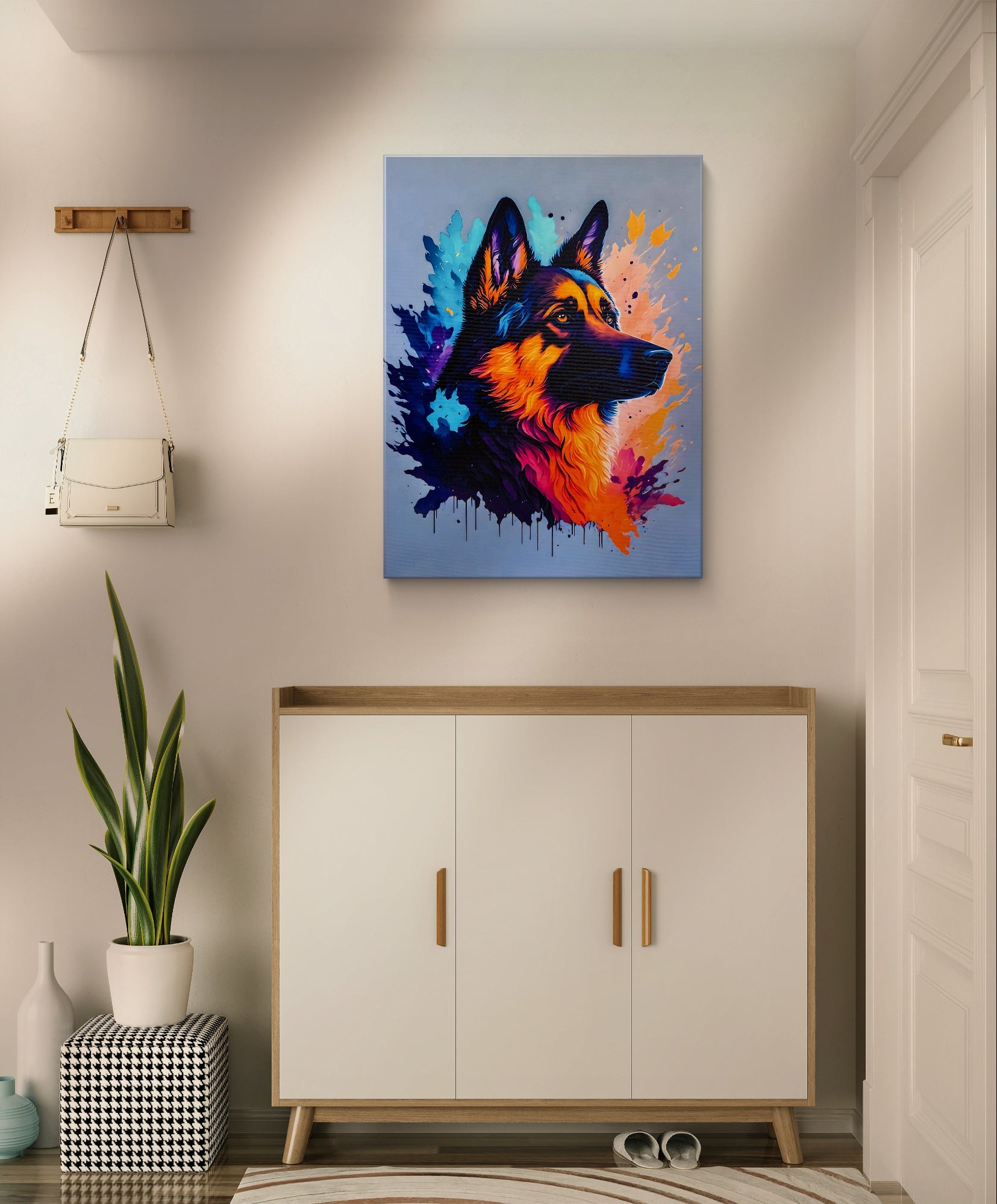 A brand new wall arts prints of german shepherd, It portrayed in bold ink-splash style. Each brushstroke suggests motion and emotion—loyalty, alertness, and deep connection. The ink flows in dynamic strokes, forming the powerful of the dog with artistic abstraction, while preserving its noble posture and sharp features. The background is minimalist, capturing both the spirit and strength of this faithful companion.