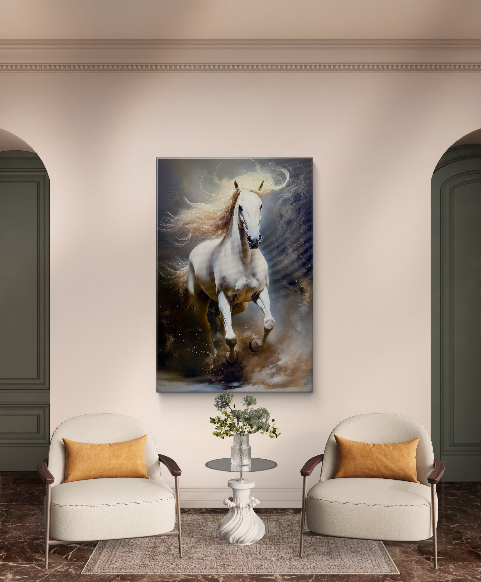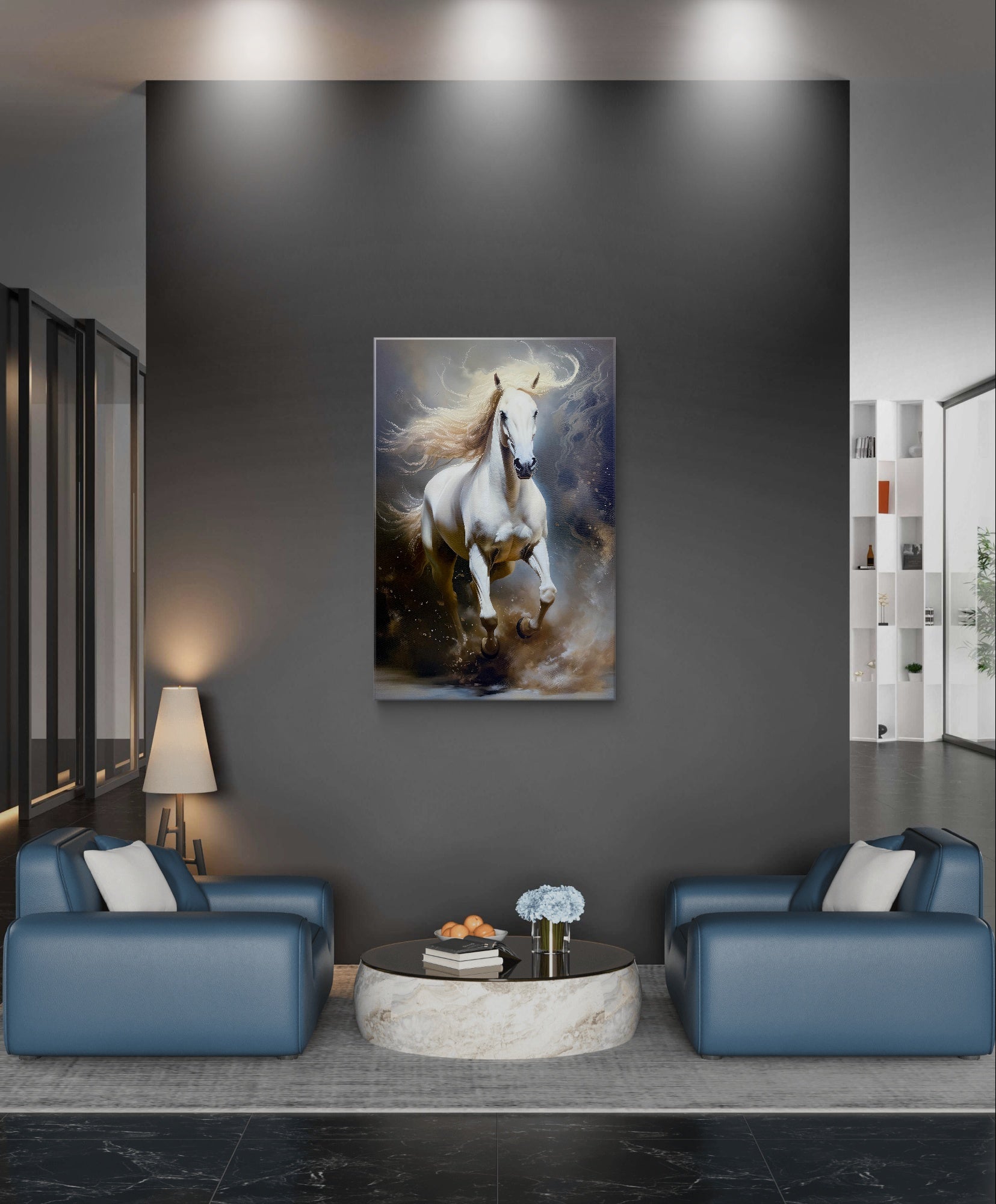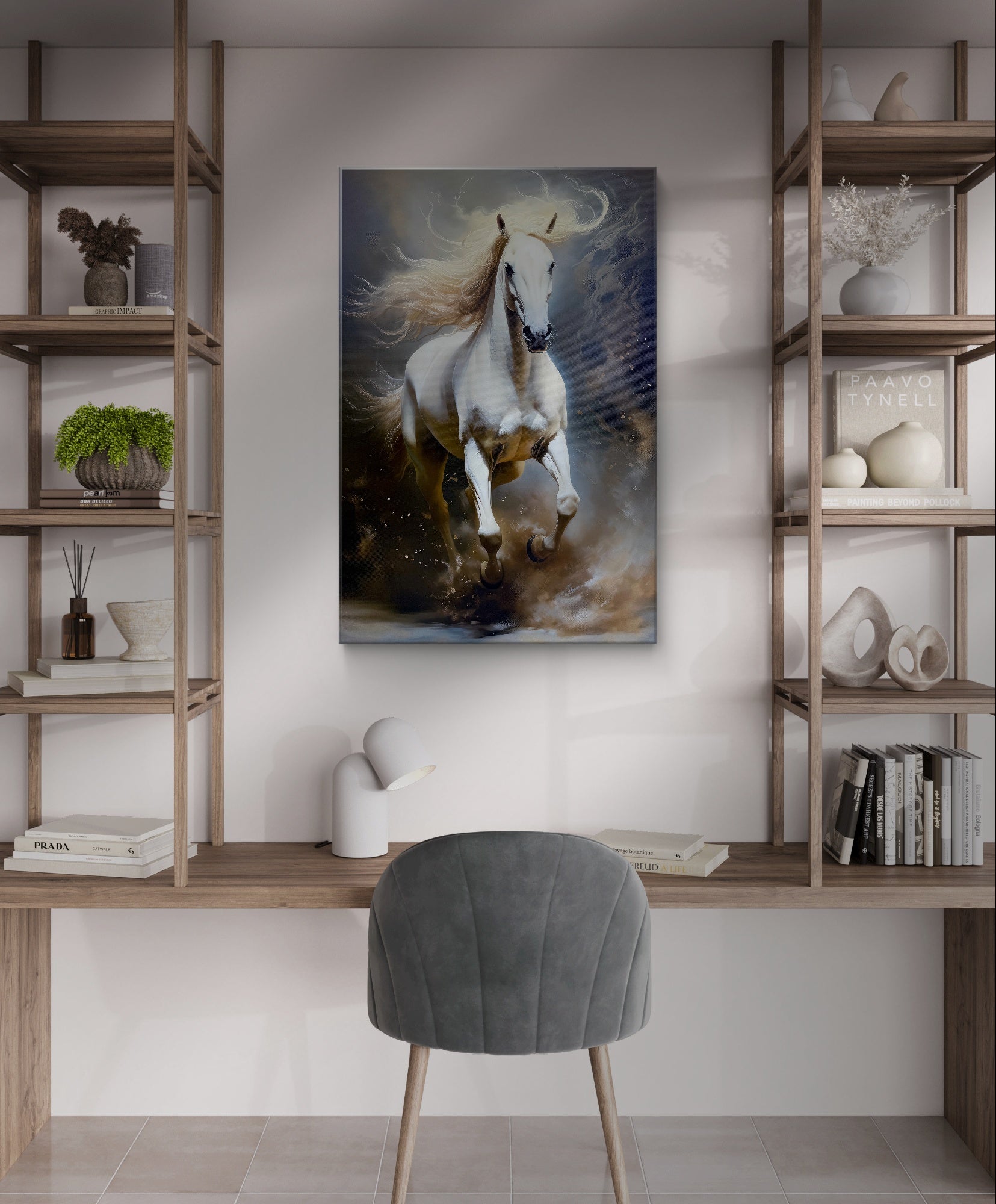 A brand new digital wall art print of a powerful white horse in full gallop, its mane and tail streaming like silk in the wind. The horse’s coat gleams with a pristine and its muscles ripple with strength and grace as it charges forward, hooves kicking up light and mist instead of dust, giving the scene a surreal, dreamlike quality. The background blends soft digital gradients and motion blur, creating a sense of speed, freedom, and digital artistry fused with natural beauty.