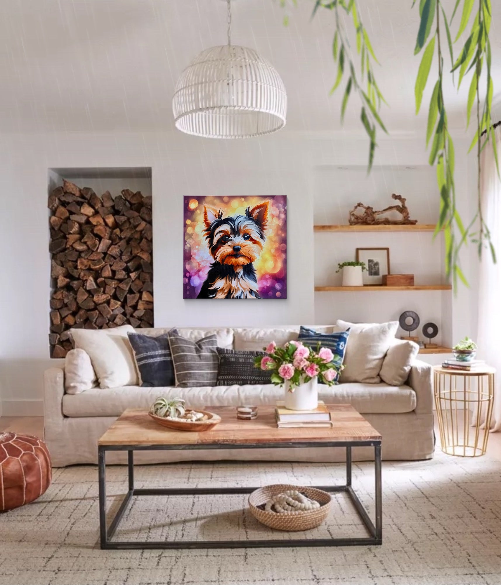 A high-definition digital print of a Yorkshire Terrier with soulful eyes, a sweet, friendly expression, and dreamy bokeh lights — a whimsical, fairytale-inspired artwork.The overall artwork blends realism with a touch of fantasy, evoking a sense of wonder and childlike joy—perfect for those who adore magical, heartwarming animal portraits.