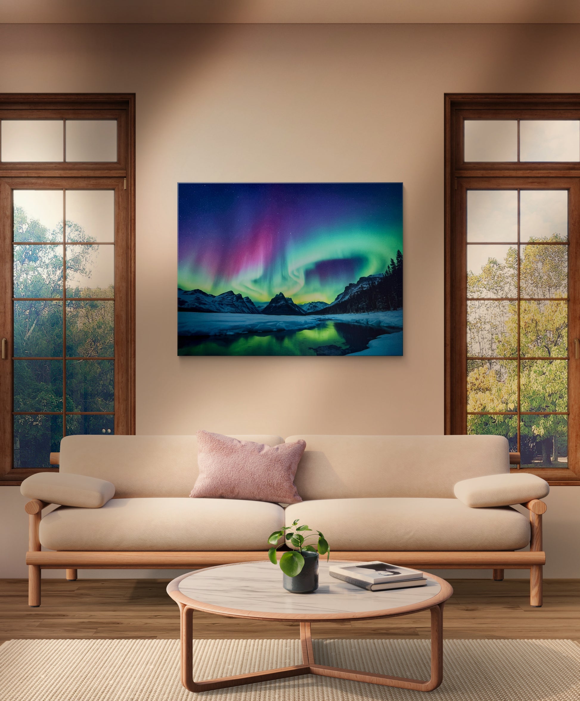 This is a high-quality wall art piece featuring a breathtaking scene of the Northern Lights dancing above a majestic icy landscape. The vibrant auroras ripple across the night sky in waves of green, purple, blue, and pink, creating a magical and ethereal atmosphere. The contrast between the icy stillness of the landscape and the dynamic motion of the aurora borealis brings the scene to life, evoking a sense of wonder and tranquility. This artwork captures the raw beauty of nature in the polar regions and makes for a striking, serene centerpiece in any modern or nature-inspired interior.